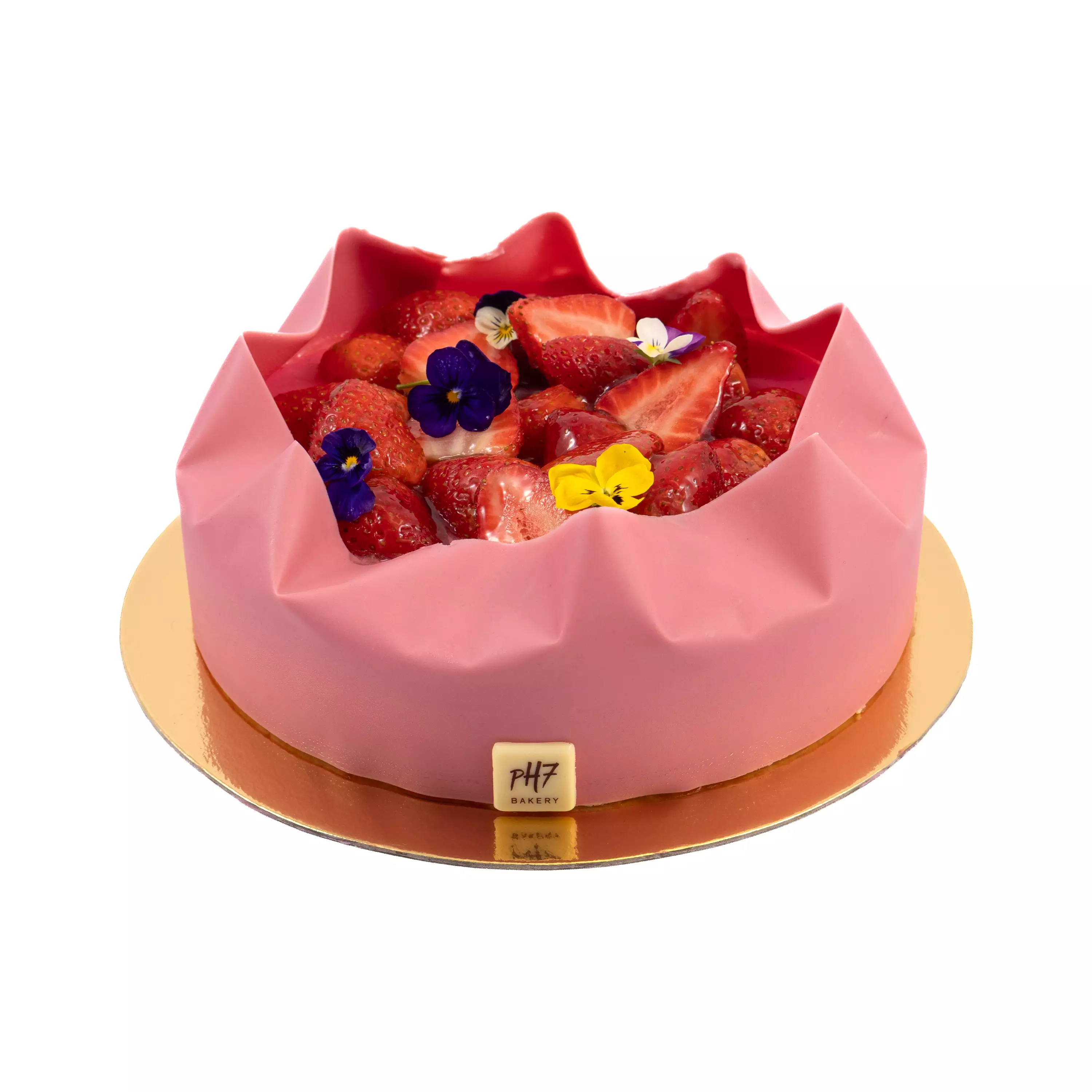 Hempeä äitienpäiväkakku. Mansikka-vaniljakakku hurmaa pehmeällä kakkupohjalla, jonka päällä lepää kerros raikasta mansikkamoussea ja sen yläpuolella silkkinen vaniljamousse, pinnalla maitokiille ja koristeena tuoreet mansikat sekä herkät orvokit, reunaa kiertää kaunis pinkki valkosuklaakoriste – täydellinen yhdistelmä makua ja eleganssi.