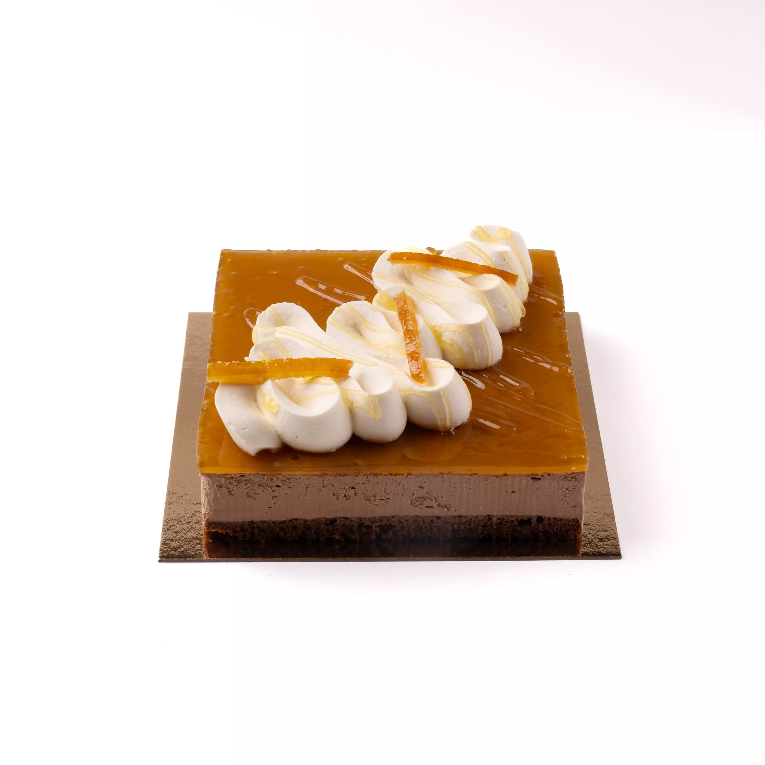 Appelsiininen kiille pursotuksineen kruunaavat kakun.