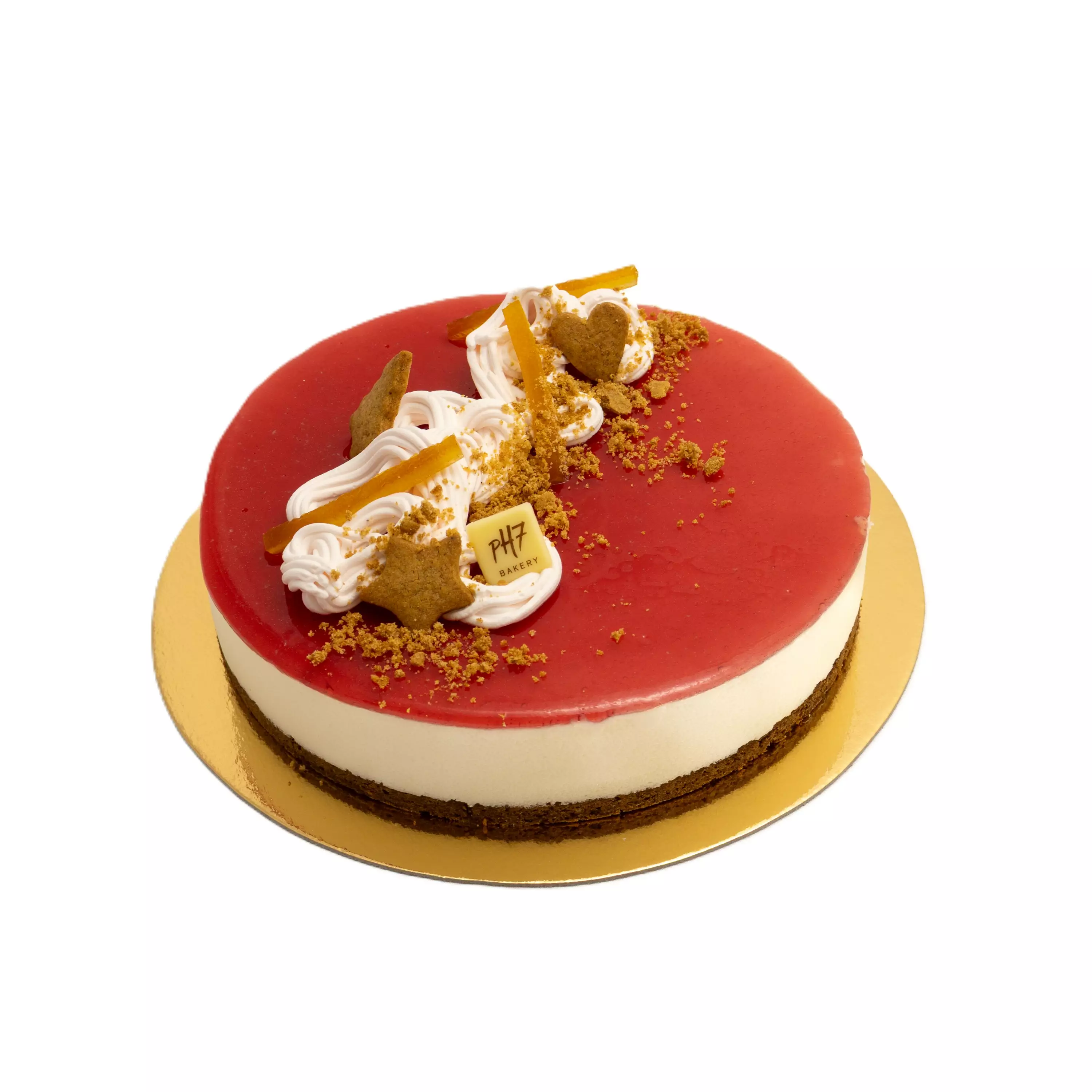 Pehmeä tuorejuustokakku, jossa glögikiille tuo joulun mausteet kirkkaan punaisena pintaan. Kiilteen päällä pursotus, piparimurua ja sokeroitua appelsiininkuorta.