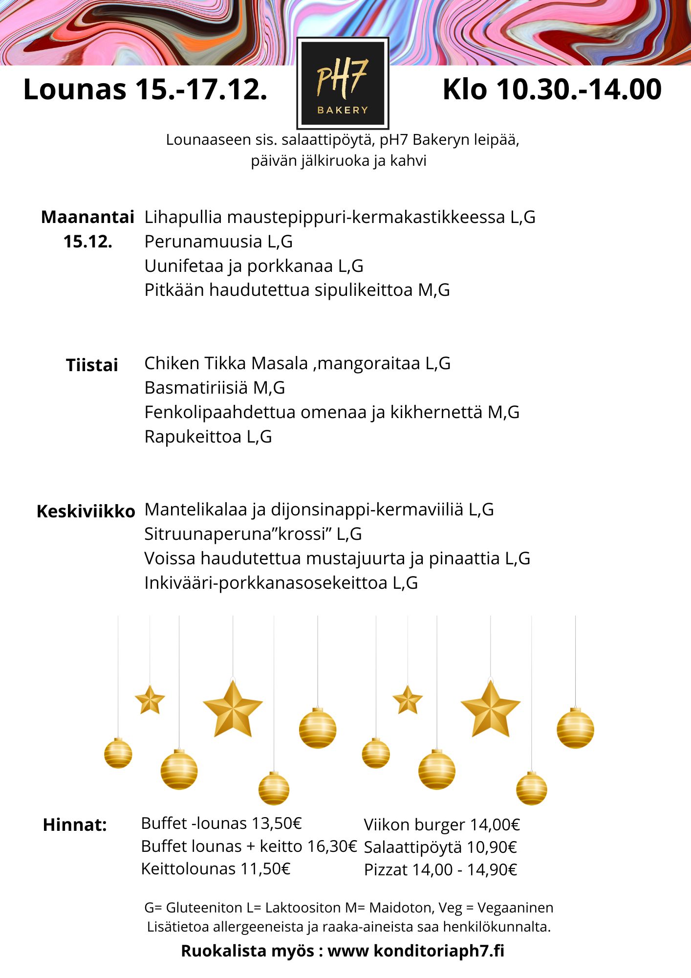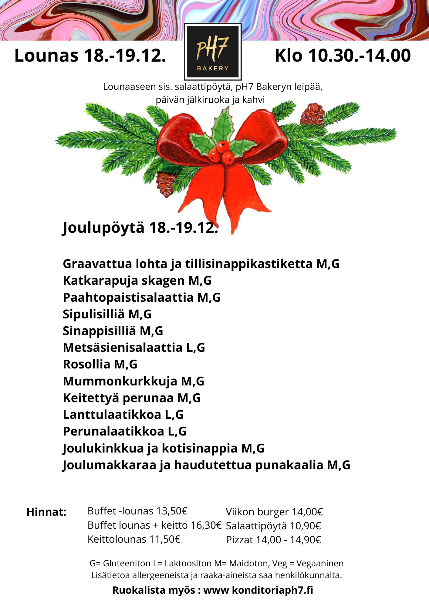 G= Gluteeniton L= Laktoositon M= Maidoton, Lisätietoa allergeeneista ja raaka-aineista saa henkilökunnalta.