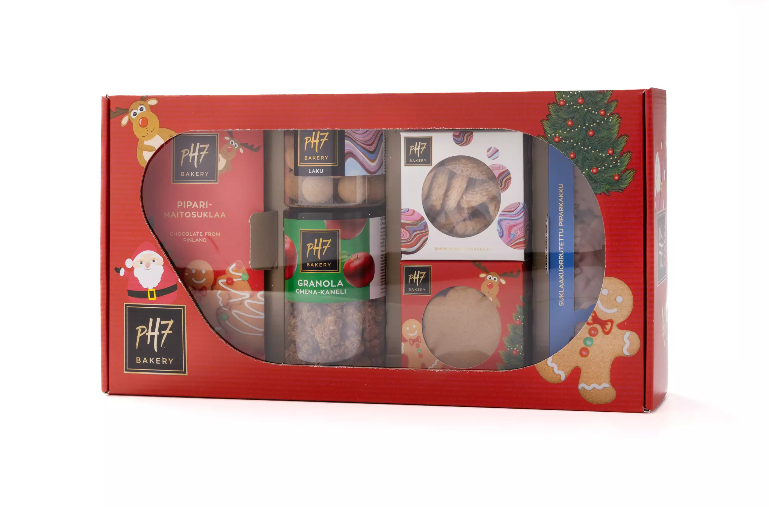 Valmis lahjapaketti pakattuna jouluiseen laatikkoon. Hyvä idea vaikkapa yrityslahjaksi,viemisiksi vierailulla tai ihan vaan itselle joulunajan herkkuja. Lahjapaketti sisältää maitosuklaisen piparisuklaalevyn,lakupalloja,omena-kaneligranolaa,perinteisiä piparkakkuja,maitosuklaakuorrutteisia piparkakkuja, ja perinteisiä ässä-keksejä.Olethan yhteydessä myynti@konditoriaph7.fi , mikäli tarvitsette tuotetta esim.yrityslahjaksi isompia määriä.