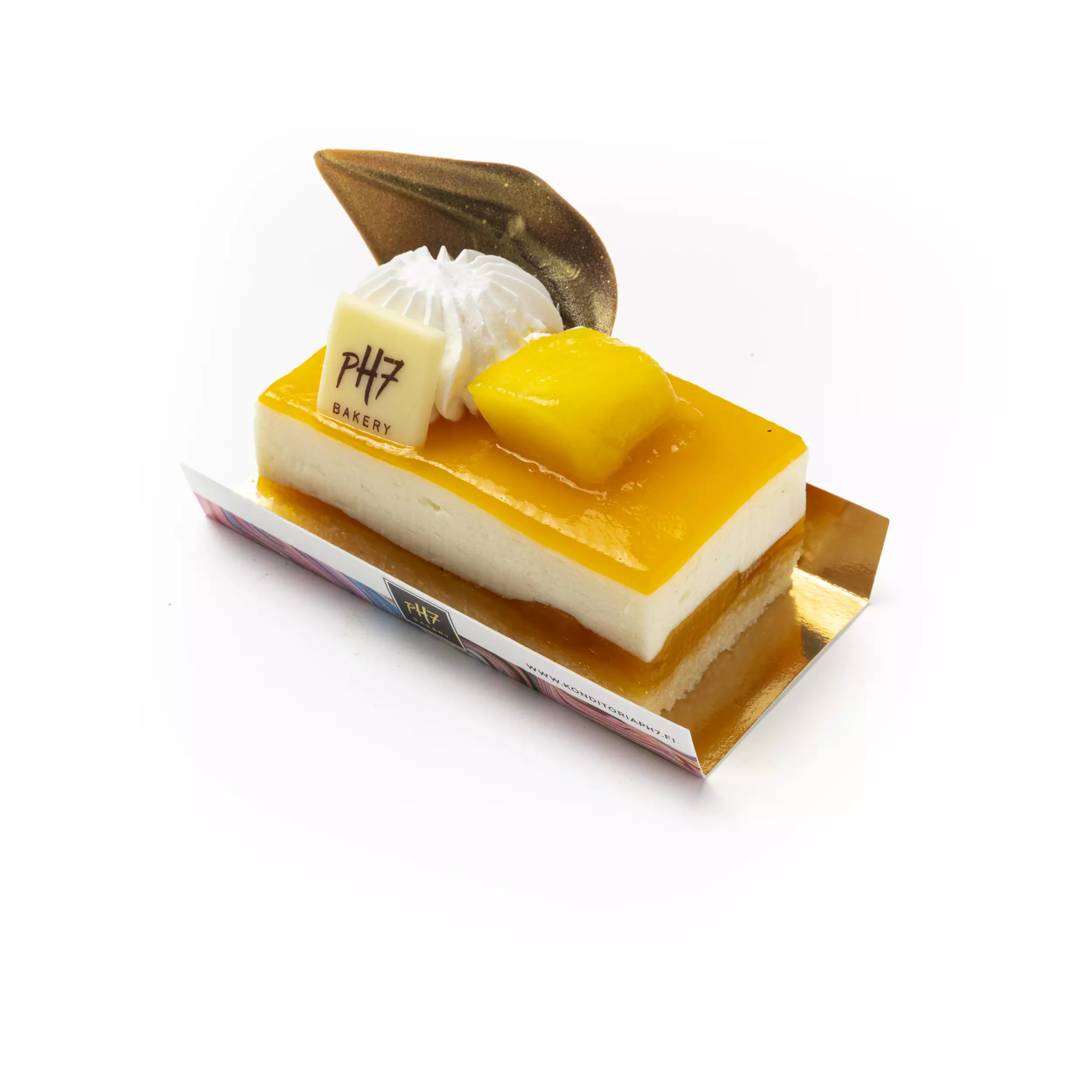 Mango-juustoleivos sisältää pehmeän kaurapohjan, mangopaloja, sekä sitruunaista tuorejuustomoussea. Päällä pirteän värinen mangokiille.