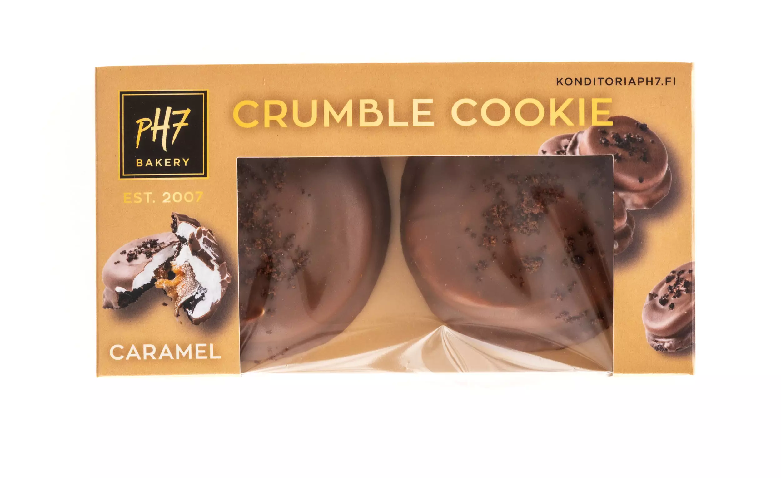 Herkullinen pH7 Crumble Cookie karamellitäytteellä.