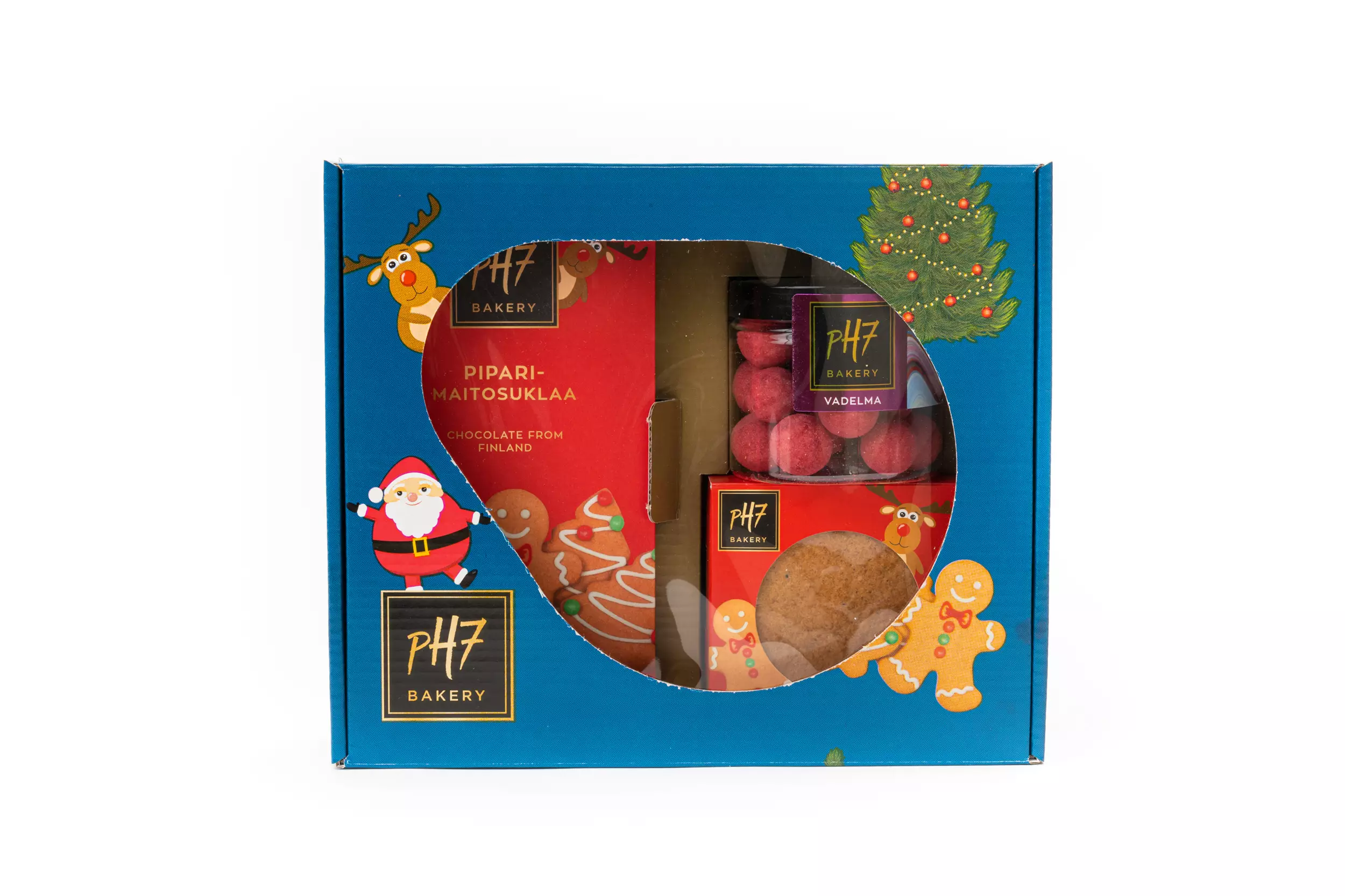 Valmis lahjarasia, tuotteet pakattu jouluiseen kuosiin. Rasia sisältää lakupalloja,perinteisiä piparkakkuja ja maitosuklaisen piparisuklaalevyn.