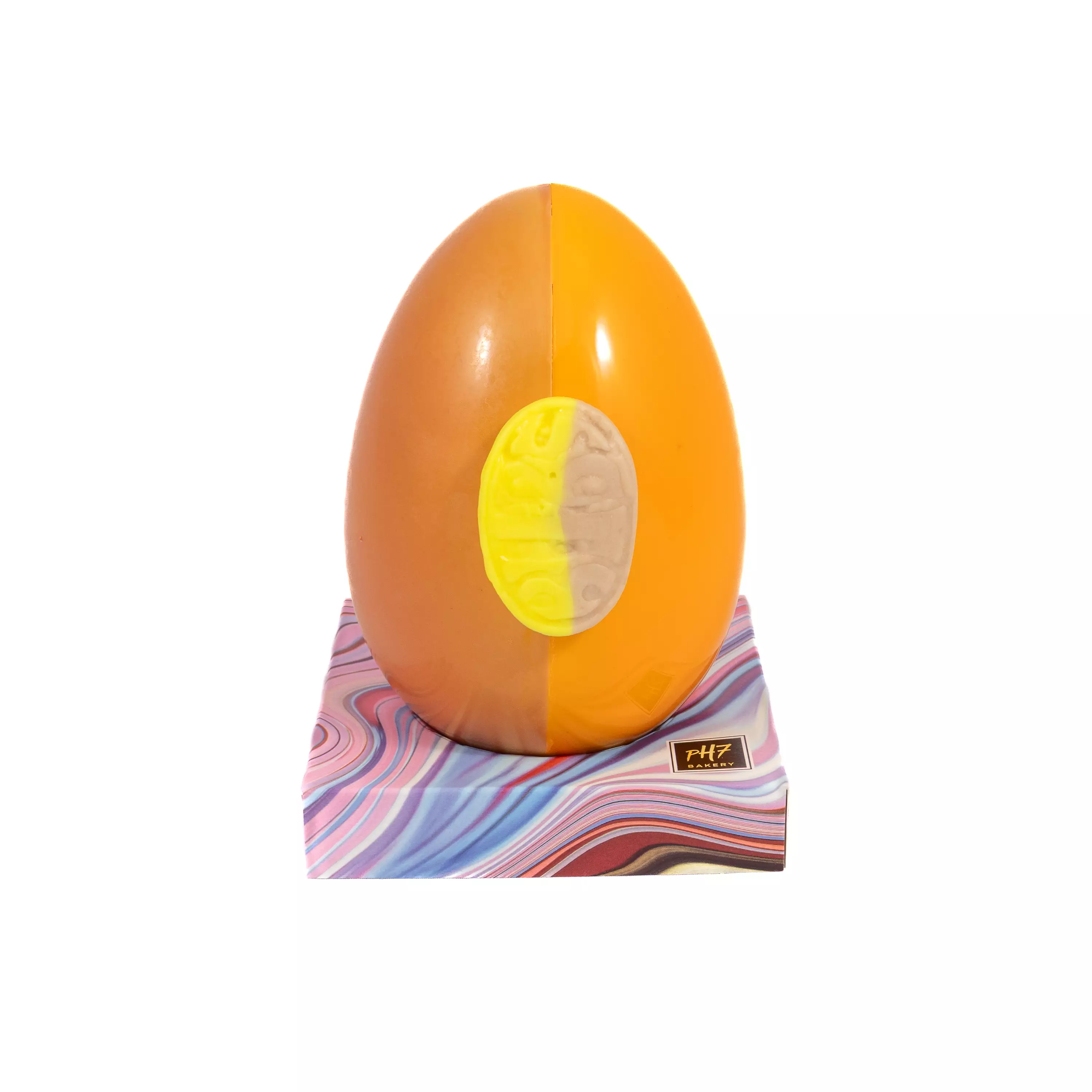 Valkosuklaasta valmistettu pääsiäismuna on maalattu näyttävästi beige keltaiseksi.