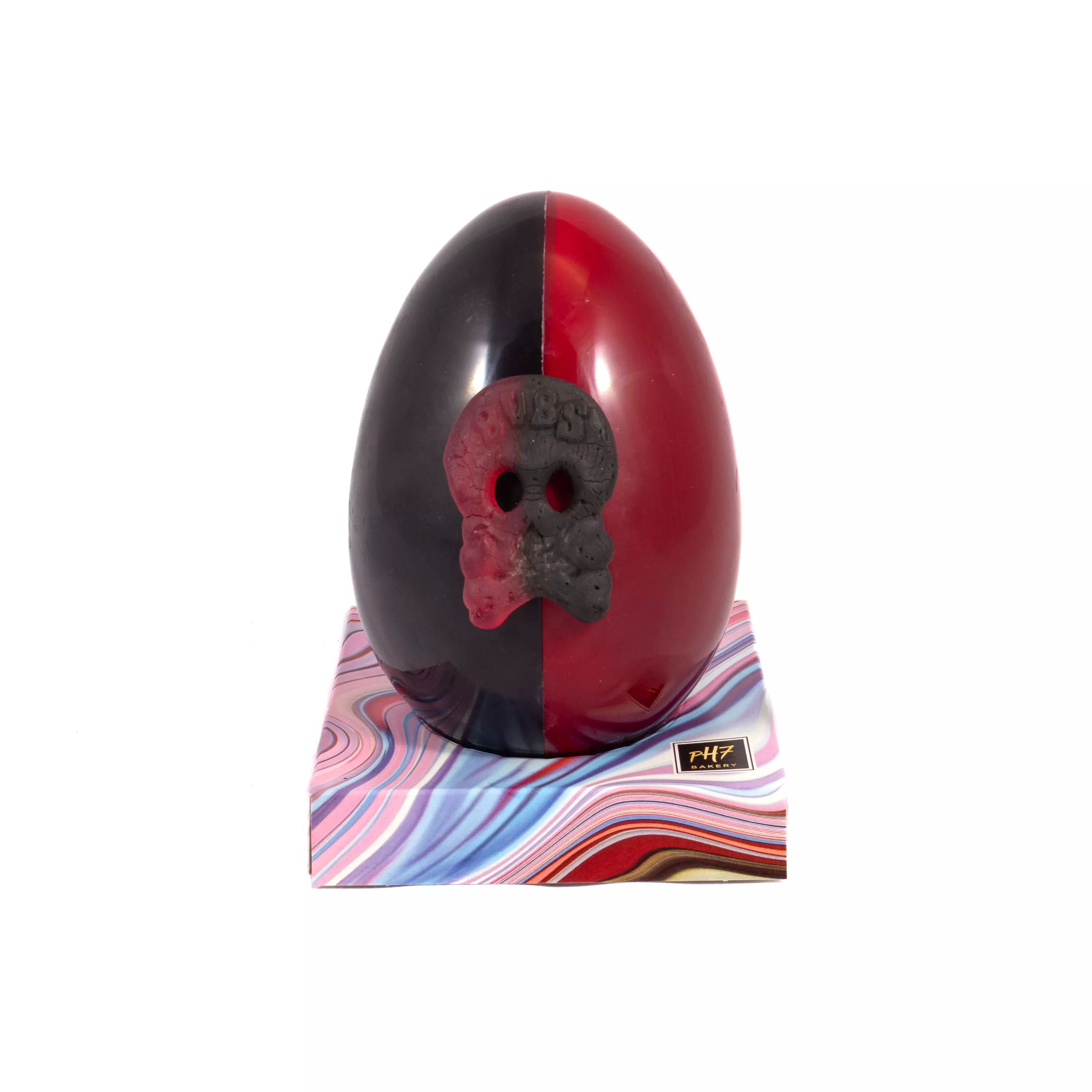 Valkosuklaasta valmistettu pääsiäismuna on maalattu näyttävästi musta punaiseksi. Munan sisällä on vadelma–lakritsi BUBS ‑karkkeja, jotka täydentävät herkun elämyksellisyyttä.
