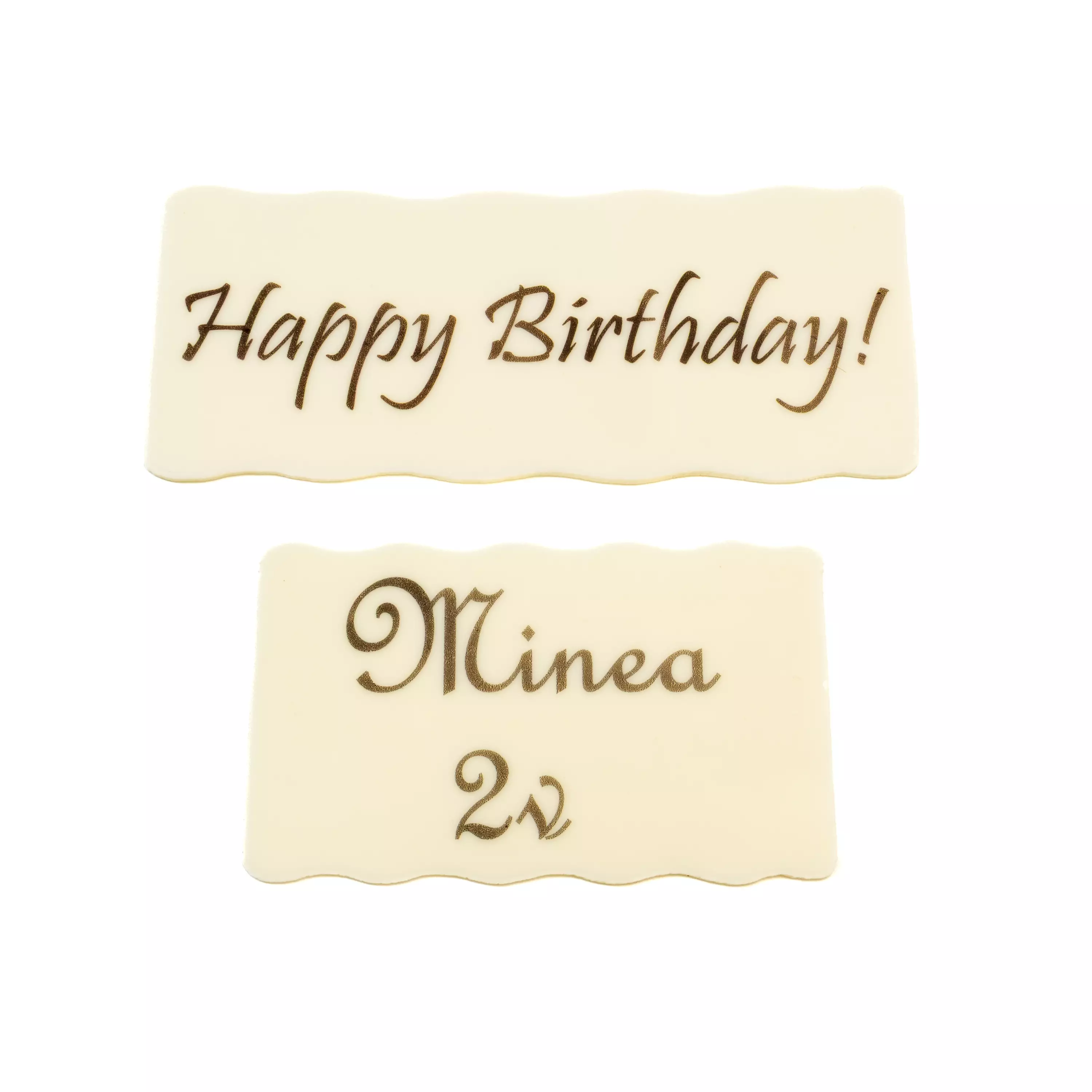 Laatta on tehty valkosuklaasta ja teksti printataan elintarvikeväreillä.