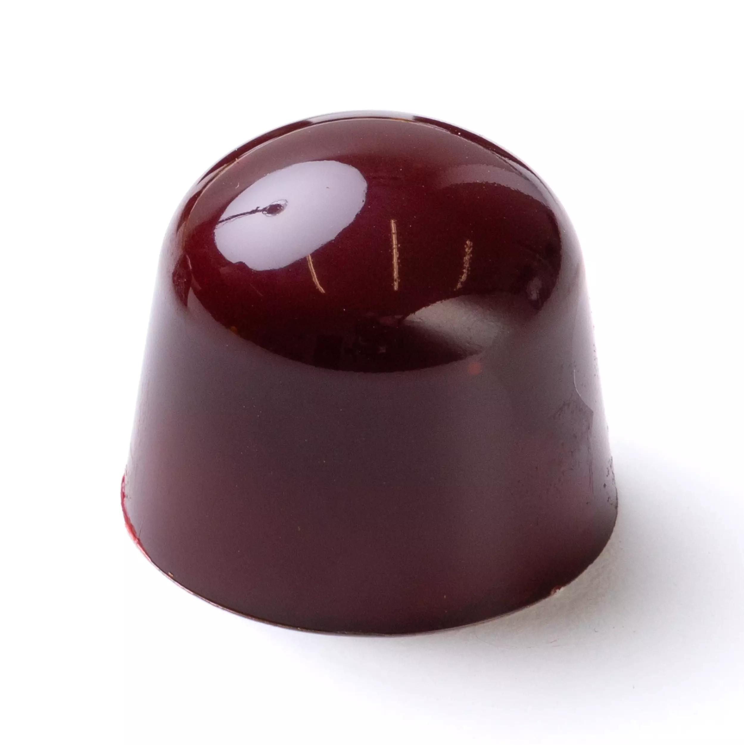 Tummasuklaata ja pehmeää vadelmaista täytettä sisältävä käsintehty konvehti.